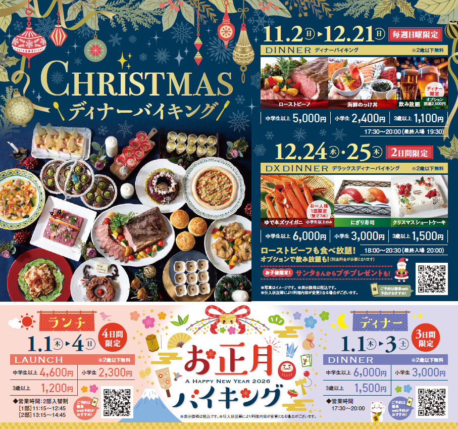特別な2日間には、ゆで本ズワイガニ(蟹足3本/小学生以上対象)やにぎり寿司、クリスマスショートケーキなど、豪華食材を使ったスペシャルメニューが登場!