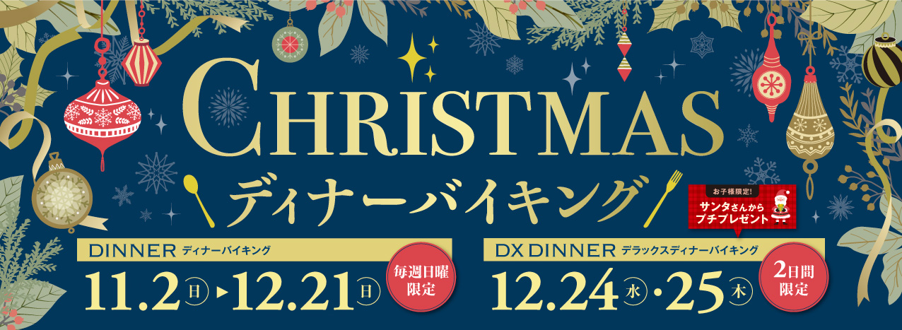 ホテルコンコルド浜松では、11月2日(日)から12月21日(日)までの毎週日曜日、そして12月24日(水)・25日(木)の2日間限定で、CHRISTMASディナーバイキング を開催いたします! 贅沢なクリスマスメニューで華やかなひとときをお楽しみください♪